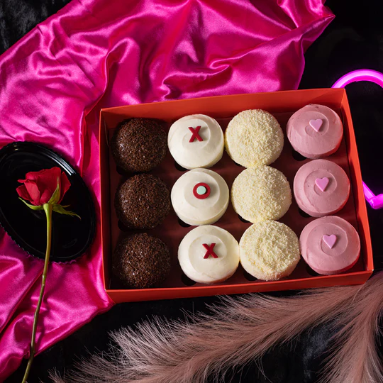 XOX Box A box containing 3 Dark Chocolate Cupcakes, 3 Red Velvet Cupcakes, 3 Vanilla Cupcakes and 3 Raspberry Chocolate Chip Cupcakes