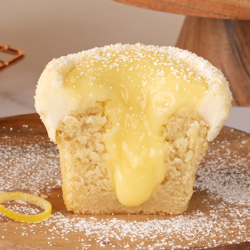 The Lemon Bar cupcake is the perfect balance of tart and sweet. This pie crust lined vanilla cake features a lemon curd core and is topped with vanilla buttercream, a pie crust rim, and more lemon curd. It's what lemon dreams are made of.