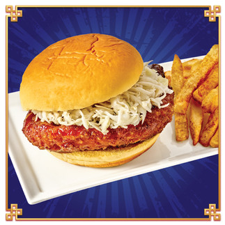 slaw, nestled in a soft potato bun, and served alongside golden curry-seasoned fries