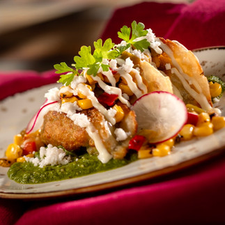 Street Corn-style Dumplings: Chicken dumplings with tomatillo salsa verde, street corn salad, cotija cheese, lime crema, and cilantro (New)