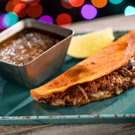 Birria Taco: Shredded beef and Monterey Jack served with a beef consommé