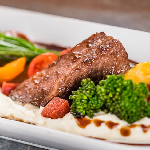 Red Wine-braised Beef Short Rib with parsnip purée, broccolini, baby tomatoes, and balsamic glaze